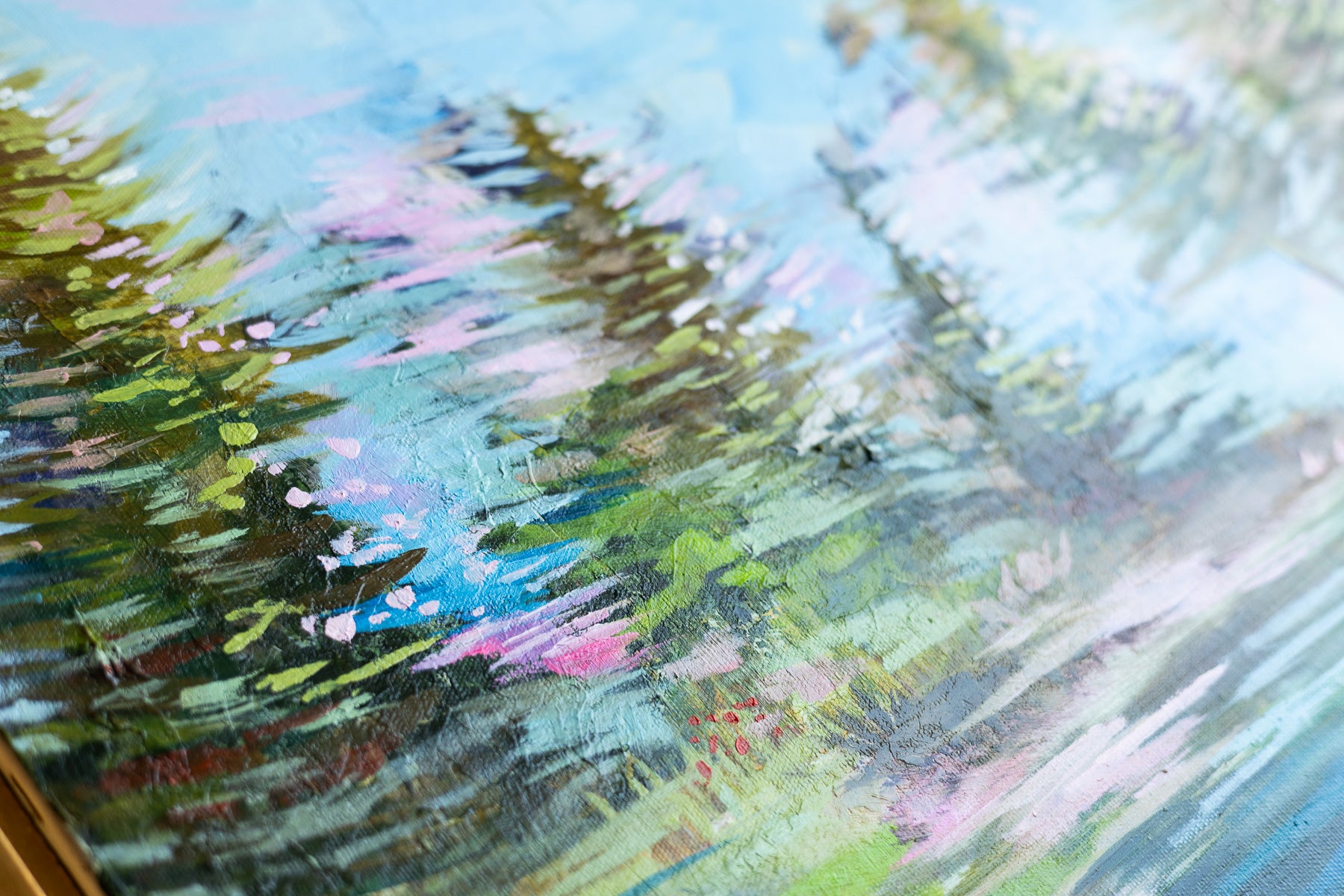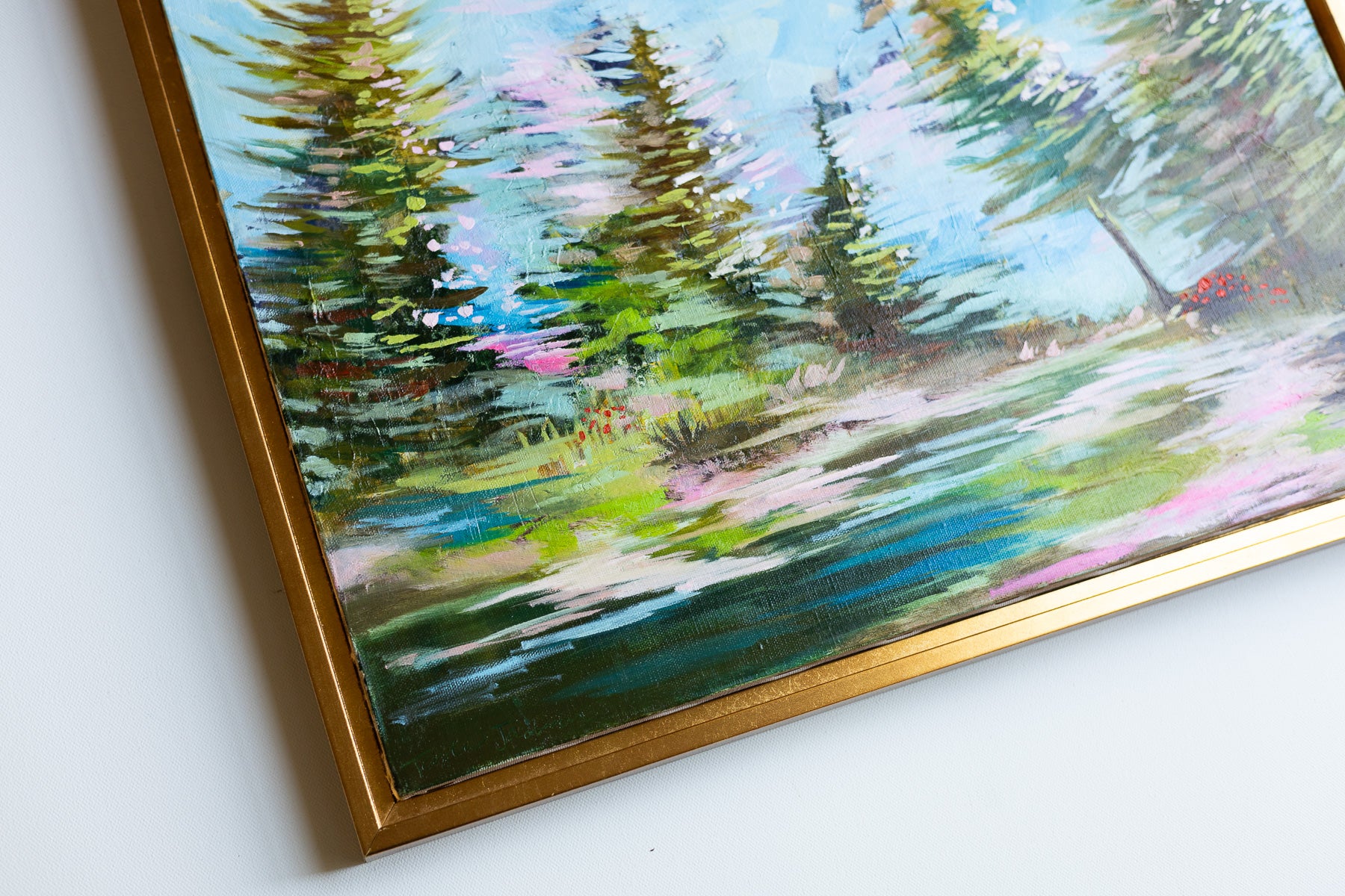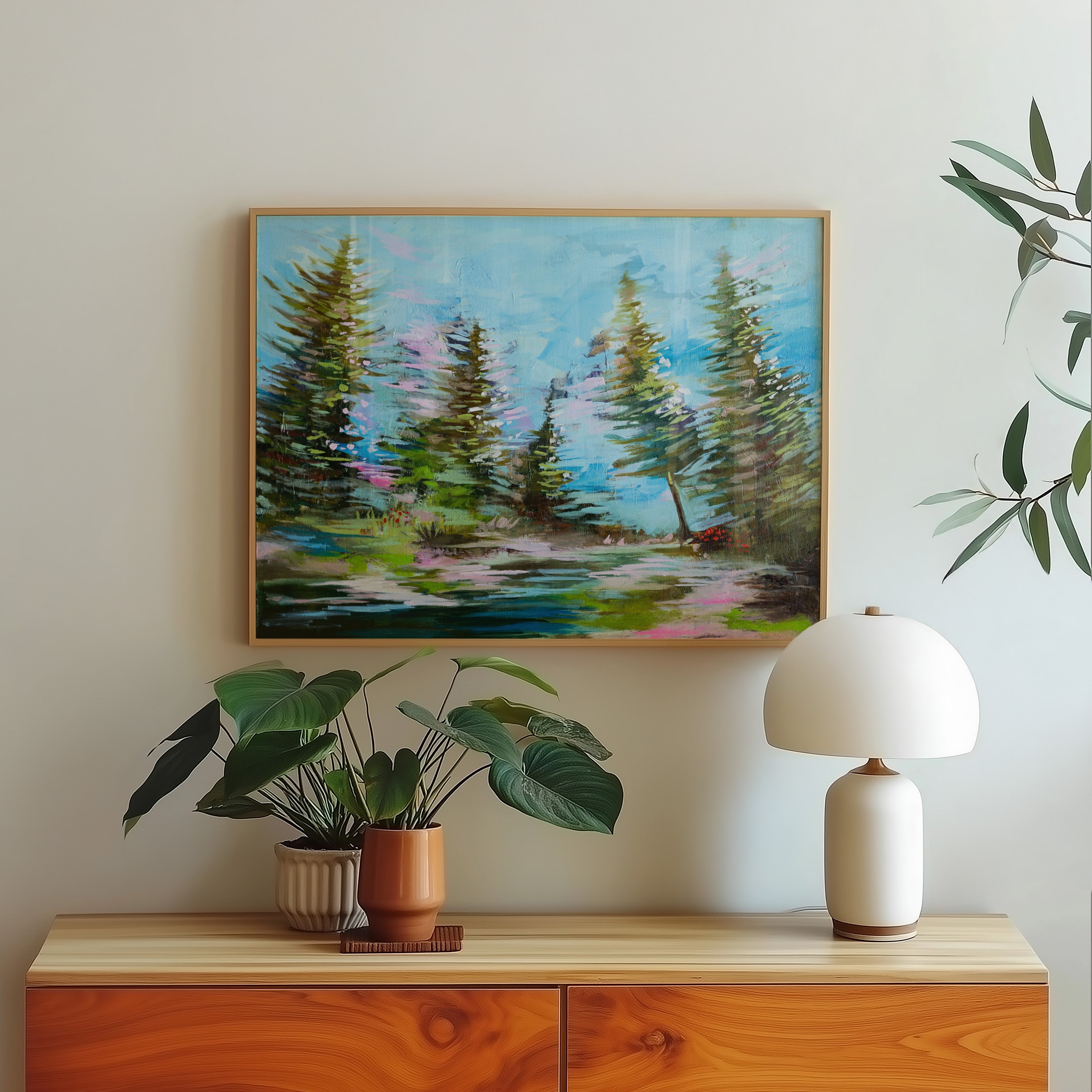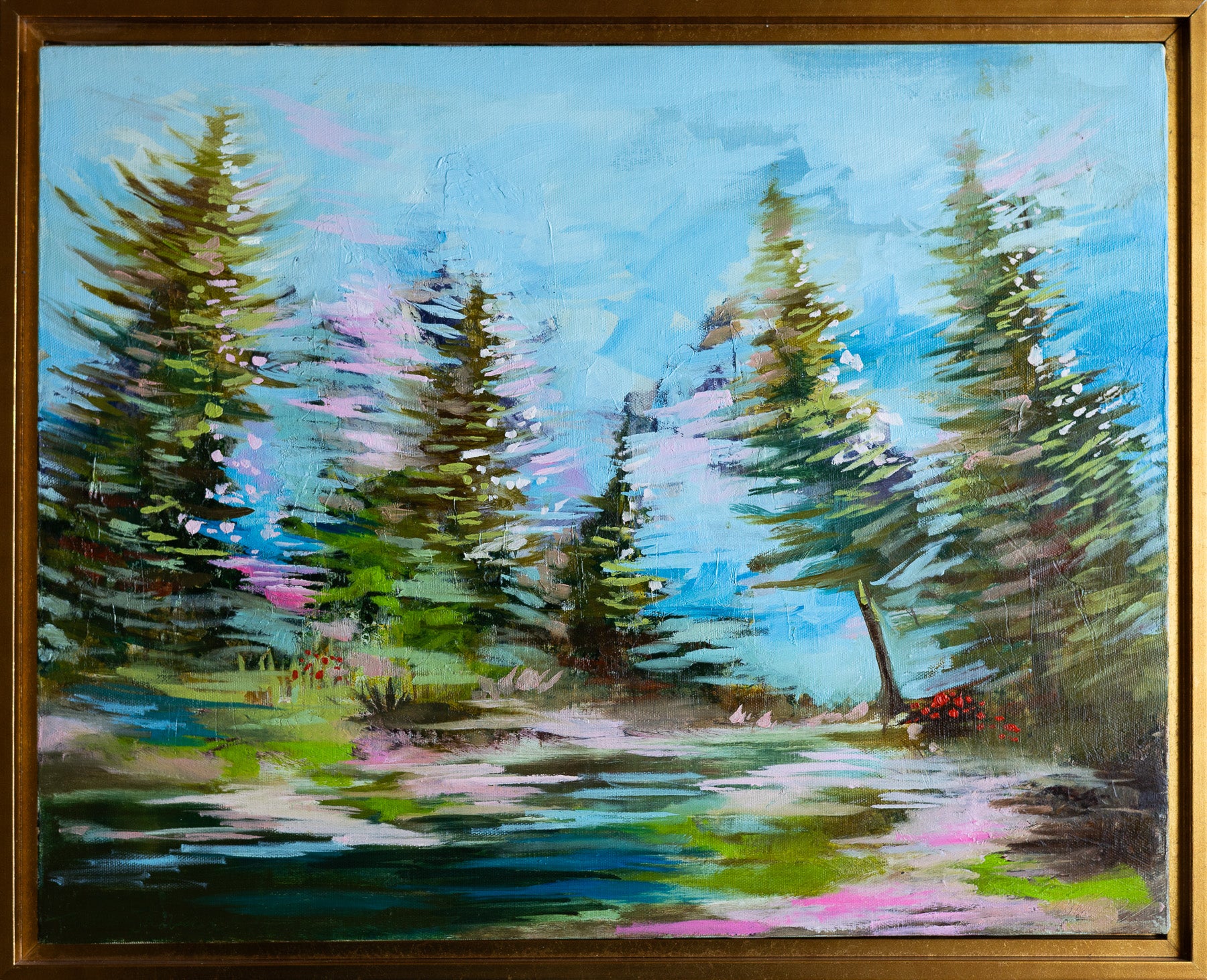 Violet Sue captures a vibrant forest scene alive with dynamic energy and movement. This 16x20 oil painting on canvas bursts with spunky color and expressive brushwork, drawing the viewer into a lush woodland landscape. The bold palette and gestural strokes create a sense of vitality and spontaneity, perfect for adding personality to any space. Available as an original framed oil on canvas or as high-quality prints, this piece brings nature's spirited essence into your home.
